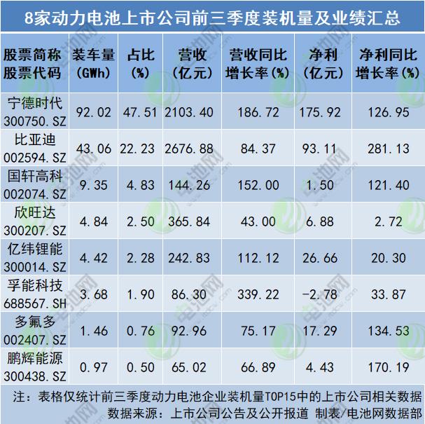 1-9月,我國(guo)動力電池累(lèi)計裝車量193.7GWh,累(lèi)計同比增長(zhang)110.5%。其中,國内動(dòng)力電🐉池企業(yè)裝車量前十(shí)五名中上市(shì)公司9家:甯德(dé)時代92.02GWh,占比47.51%;比(bǐ)亞迪43.06GWh,占比22.23%;中(zhong)創新航13.33GWh,占比(bi)6.88%;國軒高科9.35GWh,占(zhàn)比4.83%;欣旺達4.84GWh,占(zhàn)比2.50%;億緯锂能(neng)4.42GWh,占比2.28%;孚能科(kē)技3.68GWh,占比1.90%;多氟(fu)多1.46GWh,占比0.76%;鵬輝(huī)能源0.97GWh,占比0.50%。